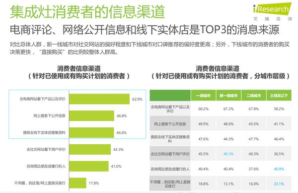 另据《消费者洞察报告》显示,集成灶产品购买渠道上,有77.4%的消费者会优先选择线上平台;而产品信息获取渠道占比最高的前六条中,四条是网络信息查询渠道。该项数据再次显示了在移动互联网不断渗透,传播方式愈发碎片化的大环境下,电商平台对于品类的发展还会起到更重要的作用。