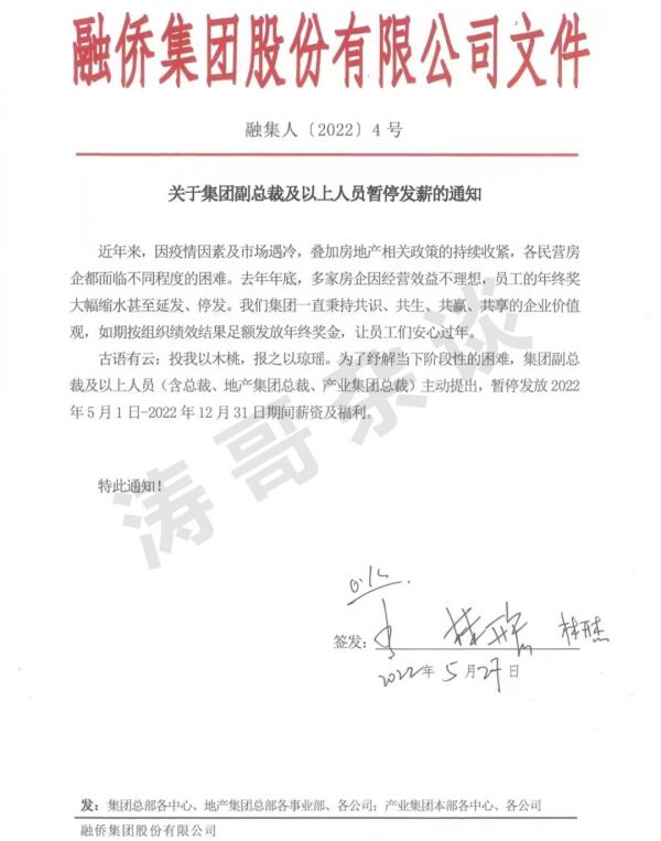 例如,去年底阳光城(000671)就表示高管集体自愿减缓薪资、共克时艰;今年融侨集团甚至直接发红头文件,公告表示高管暂停发薪8个月。