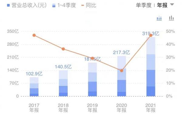 如果进一步看财务数据,会发现地产行业遭遇重创的2021年,很多地产乙方被房企拖破产的时候,东方雨虹的营业收入竟然取得近50%的增长。