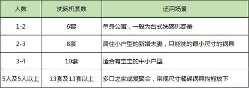 一套餐具大概是: 1 碗 + 1 盘 + 1 杯 + 1 汤碗(大的)+ 1 筷子 + 1 勺。不知道该选择多大容量洗碗机的用户,可以参考下面表格: