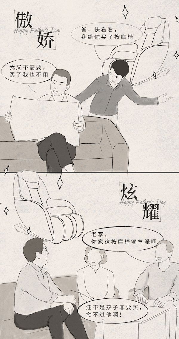 @苏欣欤:爸爸会嫌弃我给他买的衣服,但在第二天,他就会穿出去到处跟别人炫耀。要不是我叔告诉我这件事,我还真以为他不喜欢我买的。突然觉得老爸有点可爱!