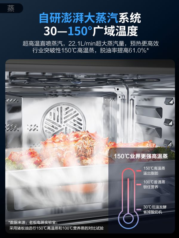 在所有烹饪方式中,蒸应该是更被健康人士选择最多的一种了。相比于传统的煎和炒,蒸不仅可以让食材更加鲜美,也能减少油脂的摄入。目前市面上传统的蒸箱普遍采用的是100°C的普通蒸,对于锁住营养来说完全够用。但为了让更多人能吃到更加鲜美、脱脂率更高的食物,老板电器CQ976蒸烤炸一体机中的澎湃大蒸汽系统拥有行业领先的150°C高温蒸很适合用来蒸大块的肉,不仅可以蒸的更快、更透,而且可以有效逼出油脂,让食物脱油率提高61%,吃的更加轻松无负担。