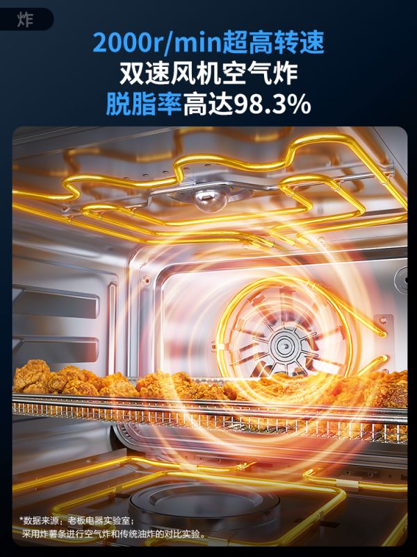 想要健康就要远离炸物?在老板电器CQ976蒸烤炸一体机面前大可不必这么控制。替代传统油炸的空气炸功能可以让你在保持健康身材的同时也不用远离酥脆的炸物,土豆、鸡翅、鸡排……各种你想吃的食物都可以无需油炸地在老板电器2000r/min双速风机的旋转中收获酥脆好滋味。同时,还有高达98.3%的脱脂率,让美味更加低卡低负担!