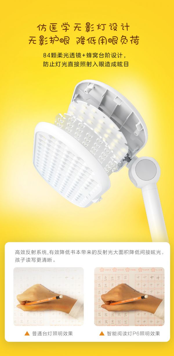 在家庭学习场景中,长时间使用低质量灯光,容易影响青少年视力健康。智能学习助手P6从灯光、坐姿、恒照度等不同层面融入诸多黑科技,助力青少年健康用眼。针对学生写作业时因手下阴影面积而导致的歪头看字等情况,智能学习助手P6参考医学无影灯的光学原理,仿医学手术室无影灯蜂巢的结构设计,将手术室无影灯搬到了书桌上,有效减少了指尖的阴影面积。同时通过专业的光学透镜设计,光照度更加的清晰和均匀,极大降低使用者的用眼负担,让学生学习更加省眼、更加专注。