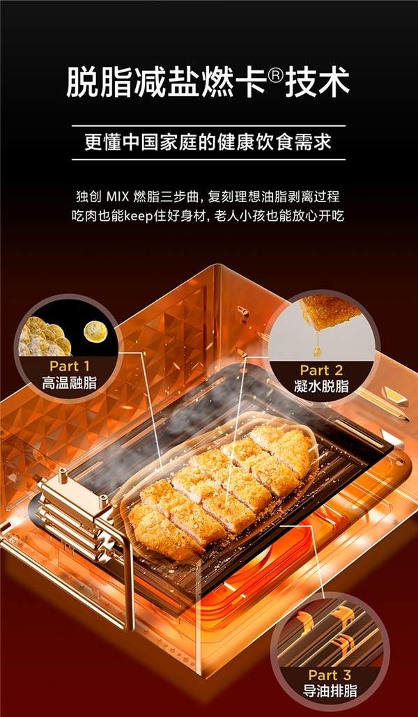 健康的膳食需要控制油脂的摄入,《中国居民膳食指南》建议,成年人每天摄入烹调油量为25~30g。而烹饪时,大多数人只关注到烹饪时的放油量,忽略了肉类本身就含有一定油脂,即使是瘦肉类也是如此。为此,美的mini微蒸烤专研脱脂减盐燃卡技术,三步复刻食物理想油脂剥离过程,脱脂率高达16%,相较于传统烧烤的脱脂率提升了72%。在保证食物美味的同时,有效降低其本身油脂及含盐量。按每人每日摄入100g五花肉计算,使用美的mini微蒸烤燃卡技术,一年可减少2.6L油脂摄入,热量消耗约等于跑7个马拉松。