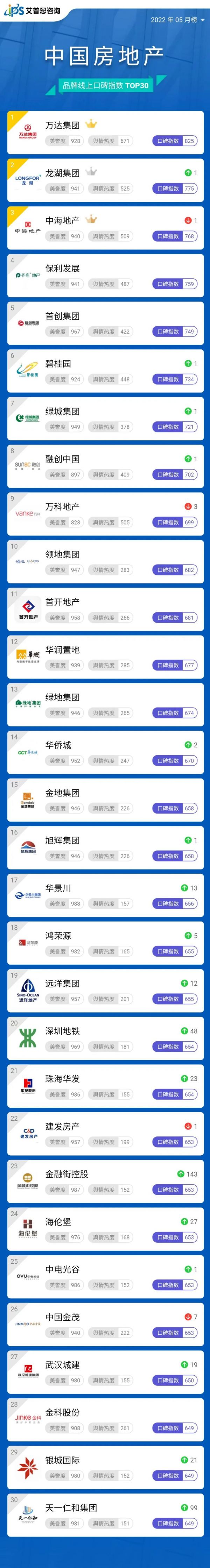 艾普思咨询:2022年05月中国房地产品牌线上口碑指数TOP30