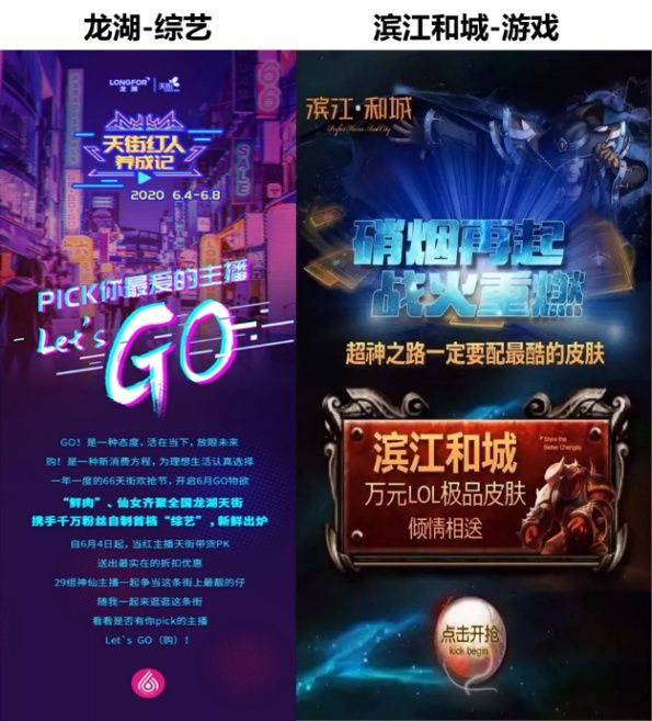 娱乐作为当今年轻人日常生活的重要内容,房企通过跨界综艺和游戏等可以快速与潜在客群建立链接。结合时下当红的养成综艺,龙湖将多种元素叠加融合通过同步开启“天街红人养成记”,凭借29组直播组合的不断档直播,迅速形成爆点,并将流量顺利转化成销量,深化品牌形象。成都星晟置业的滨江·和城项目,通过对周边软件园区内5万余青年人做了调研后选择“英雄联盟”作为跨界对象。在充分了解玩家兴趣和需求的基础上选择以游戏皮肤作为奖励,设计了H5互动游戏,并协办城南软件园电竞大赛,借助比赛的热度,迅速拉近与目标客群的距离,提高楼盘的知名度。