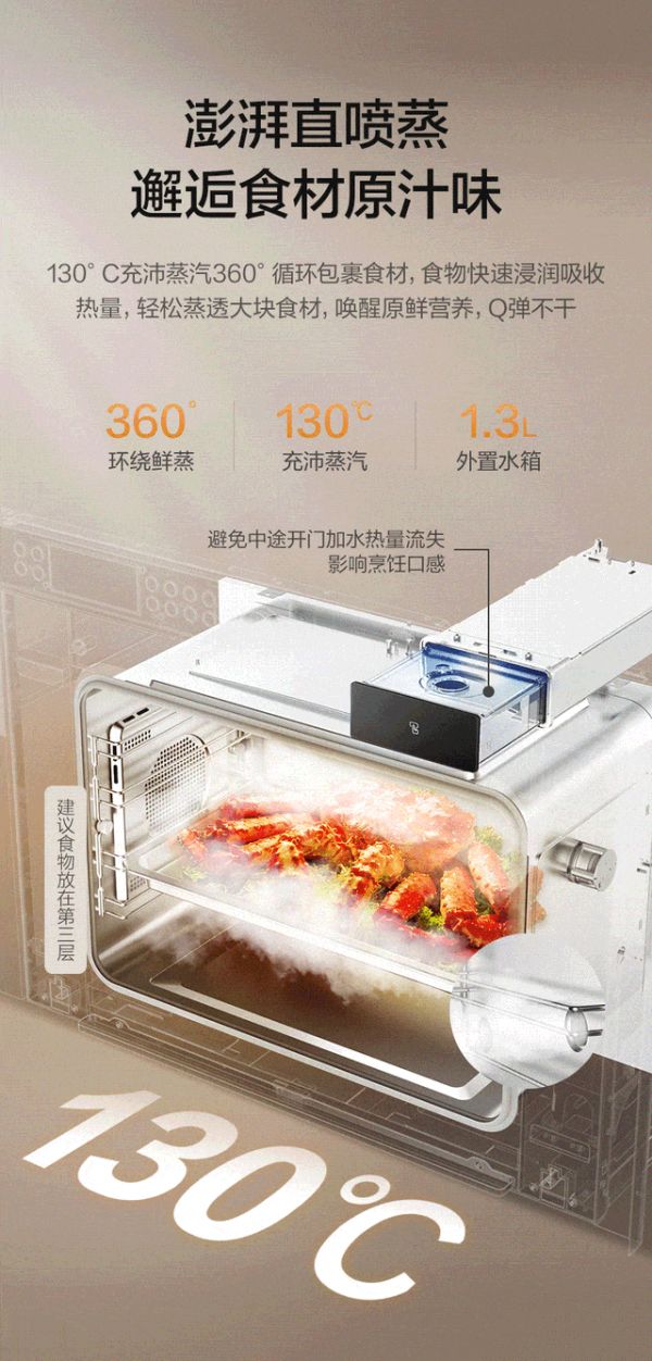 烹饪方式有很多,“蒸”能极大保留菜品营养,因此颇受广大用户喜爱。两款新品在蒸煮这一烹饪方式上也下足功夫,具备澎湃直喷蒸功能。相比传统煮水盘加热方式,避免了反复使用千滚水,采用1800W活水高能大蒸汽,烹饪食材更健康、蒸汽量更大,能快速充盈内腔,360°动态紧裹食材,迅速浸润食材,牢牢锁住食材原本的水分和营养,还支持130℃充沛蒸汽高温蒸,可瞬间包裹食材、渗透肉质,轻松蒸透大块食材,还原食材鲜嫩口感,保留食物原汁原味。