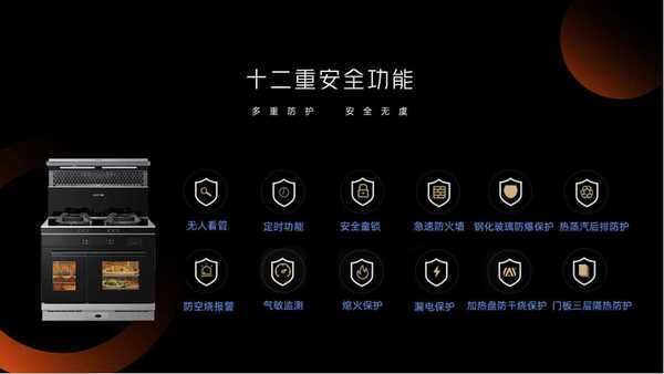 无人看管技术 炉火定时功能 、防空烧警报、热电偶熄火保护、防火墙、气敏检测技术、安全童锁、电源漏电保护插头等12大安全防护,更让烹饪无担忧!