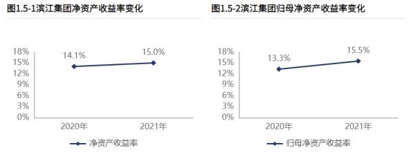 2021年滨江集团净资产收益率15.04%,相较于2020年股东回报水平基本稳定;归母净资产收益率15.55%。相较于2020年对母公司股东回报水平提高。