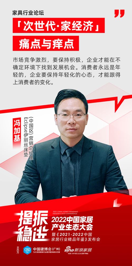 在7月8日举办的家具行业论坛《次世代·家经济:痛点与痒点》中,Eclipse伊丽丝床垫(中国区)营销总经理冯加基发表了自己的观点:健康睡眠正在成为全民共识,Eclipse伊丽丝床垫立足于行业前沿需求,从形象升级、产品年轻化和渠道等多维度进行深度布局,挖掘“睡眠经济”带来的巨大市场潜力。市场竞争激烈,要保持积极,企业才能在不确定环境下找到发展机会。其次,消费者永远是年轻的,企业要保持年轻化的心态,才能跟得上消费者的变化。