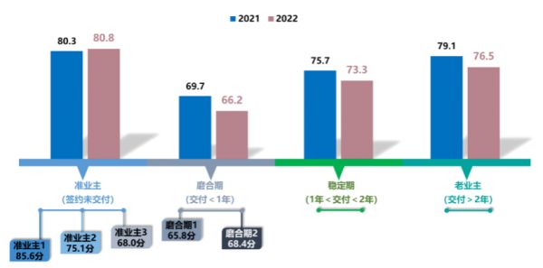 交付服务满意度为69.8分,较2021年下降2.5分,连续两年下滑后,已跌破70分关口,降至近5年来的最低水平。中指院认为,近两年交付阶段客户评价的明显下降,一方面源于前期“高调”销售激发的高预期无法在交付阶段得到落实,另一方面则是由于房企资金紧张等情况导致了不同程度的“减配交付”、“延期交付”。