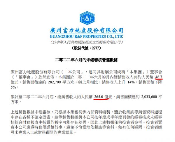 2022年1-6月份,该集团总销售收入约人民币265.0亿元,同比下降59.3%;销售面积达约203.36万平方米。