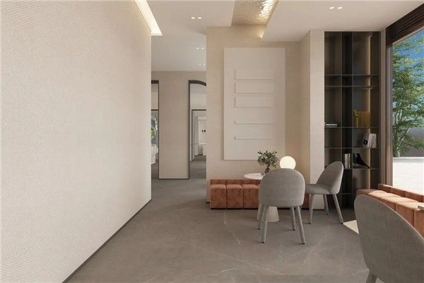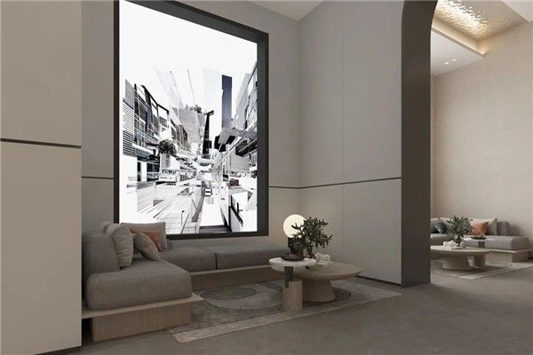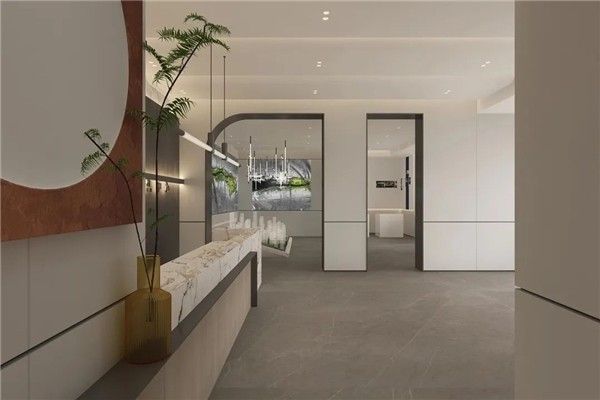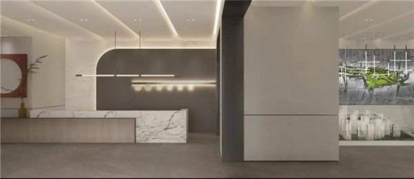 售楼处总体效果通透、明亮,与品牌整体形象相符,大面积艺术涂料墙面,塑造了简洁、大气、带有高贵新锐的品质感。