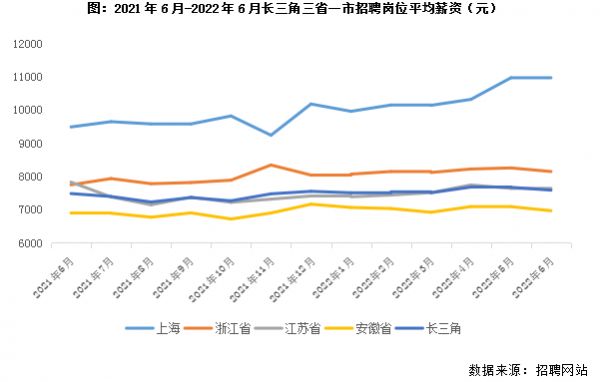 长三角企业招聘月薪基本保持在7500元附近,上海同比上涨16%居首。尽管长三角企业大幅缩减招聘岗位,但由于“抢人”大战渐趋白热化,薪资收入趋势性走稳,月薪基本保持在7500元附近,高素质人才普遍拥有较高的薪资收入。
