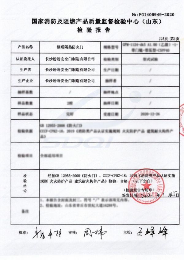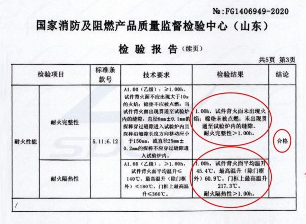 根据国家消防及阻燃产品质量监督检验中心出具的检验报告显示,在标准试验条件下,盼盼防火门耐火完整性>1小时,耐火隔热性>1小时;盼盼防火门的耐火性能合格,符合国家标准。