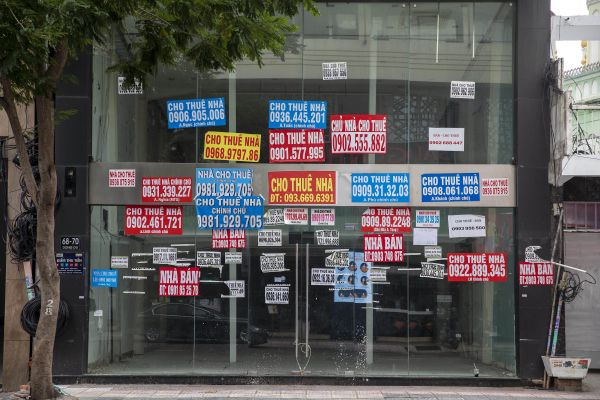 越南一家待招租店铺门口挂满了房产广告,对越南年轻人而言,卖一套房子,相当于打4个多月工。 图源:Getty