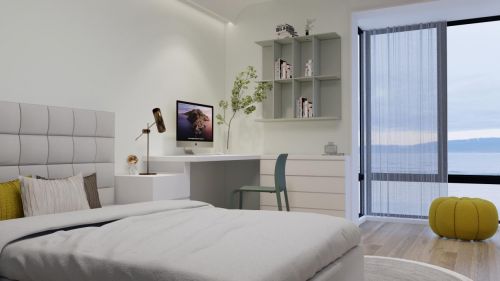 白色墙面与柜面,搭配奶油色家具,让人不由自主的关注到优雅的调性与细节。考虑到家居储物的柜体应用,在融合空间美感的同事,更有效的完成了归置与收纳效果。在软装搭配上,一个带有蝶翅蓝的妆凳,就能通过色彩的混杂与明暗的调节,带来无限惊喜感。