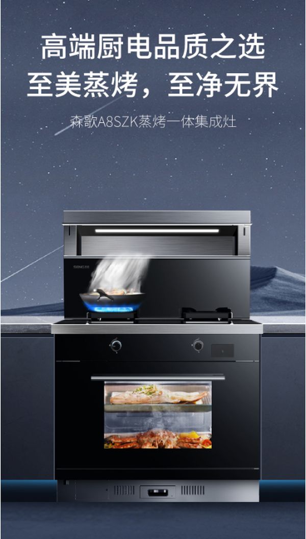 而备受期待新升级的A8S蒸烤一体集成灶同样承载森歌集成灶惯有的优秀基因,此外在核心性能上做了更多升级与优化,比如在灶具燃烧系统上采用了专利设计的12腔直喷燃烧器,让烹饪更高效;蒸烤板块上除8大蒸烤模式优势外,还采用了一体拉伸纳米陶瓷内胆,使蒸烤箱拥有更快的升温速度,值得一提的是蒸箱创新采用了蒸箱内胆余水控制系统,有效避免二次污染,让家庭烹饪更省心安心;A8S选用高品质直流变频电机,爆炒风量可达20m³/min,内置FOC矢量智能数字算法,自带变频增压功能,就算是烹饪高峰也无惧倒灌。A8S融汇了森歌对新时代理想厨房的全新思考,可以预见的是,A8S将进一步加强森歌在蒸烤市场的霸权地位。