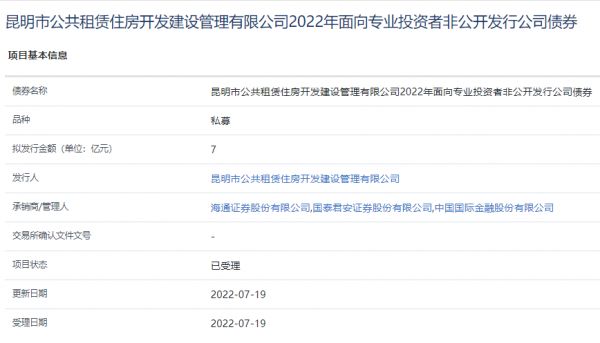 中国网地产讯 7月19日,据上交所披露,昆明市公共租赁住房开发建设管理有限公司2022年面向专业投资者非公开发行公司债券已获上交所受理。