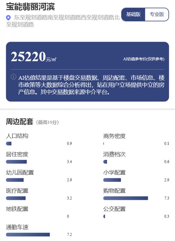每经品房小程序显示,宝能翡丽河滨的估值参考价为25220元/平方米。在购物配置、通勤车速等领先于区域内其他小区,但在教育、医疗、公共交通等方面处于板块内落后水平。
