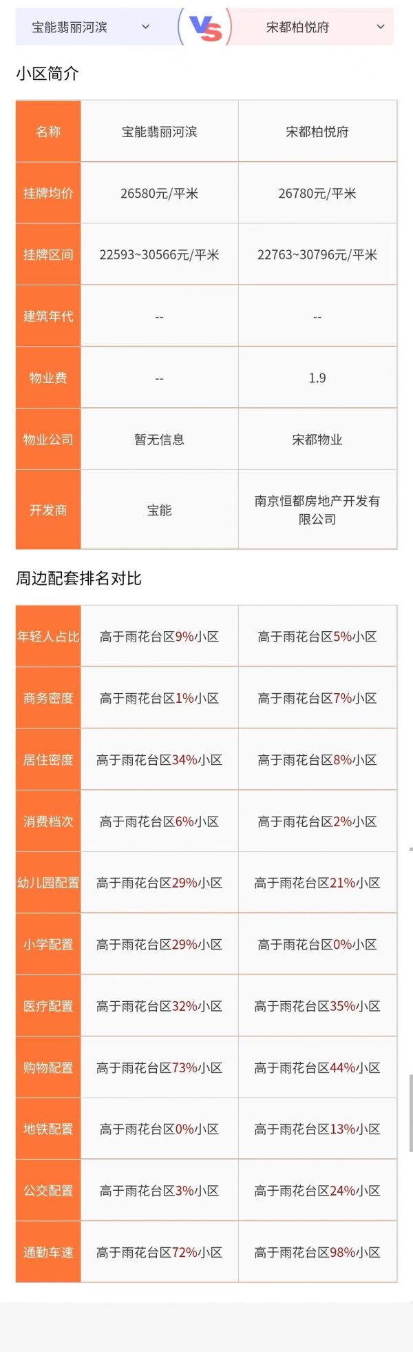 至于未来几年的房价走势,每经品房小程序显示,宝能翡丽河滨房价涨幅将高于雨花台31%的小区,宋都柏悦府仅高于雨花台9%的小区。