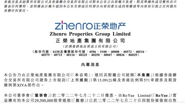 7月22日,正荣地产港交所发布公告,称7月20日,控股股东欧宗荣全资拥有的RoYue所持2950万股被强制出售,占本公告日期公司已发行股本总数约0.68%。转让后,RoYue共计持有20.50亿股,占正荣地产总股本的46.95%。且欧宗荣及其家族成员合共持有公司已发行股本总数约59.35%的权益,仍保持绝对控股地位。