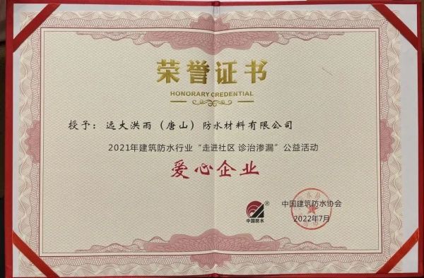 会上,中国建筑防水协会为远大洪雨授予2021年建筑防水行业“走进社区 诊治渗漏”爱心企业证书。