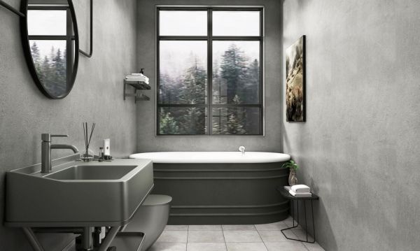 用混凝土为你的现代浴室设计增添工业气息。一个混凝土浴室听起来可能看起来很粗糙,但是引入弯曲的家具,温暖的木材色调和室内植物将会软化这个外观。