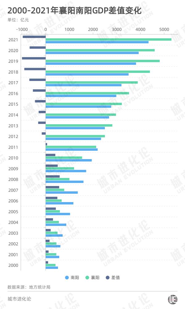 此前,襄阳和南阳曾多次以“竞争对手”的形象示人。2012年,同为省内GDP第三城的襄阳和南阳曾上演过一出经济总量上的“追逐战”——多年落后的襄阳,以164.6亿的差距反超,到去年差值已扩大至967.21亿元。