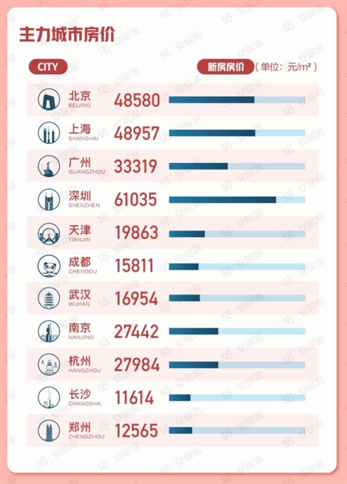 58同城、安居客《7月国民安居指数报告》显示,7月65城新房线上均价为17585元/㎡,环比上涨0.37%,全国重点65城中有28城新房房价环比上涨。一线城市中,深圳新房线上均价为61035元/㎡;上海和北京新房线上均价分别为48957元/㎡和48580元/㎡;广州新房线上均价为33319元/㎡。新一线城市中,杭州和南京的新房线上均价分别为27984元/㎡、27442元/㎡;成都为15811元/㎡、长沙为11614元/㎡。