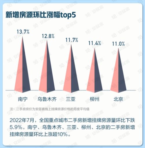 2022年7月,全国重点城市二手房新增挂牌房源量环比下跌5.9%,从全国范围来看,北京、三亚、南宁、乌鲁木齐、柳州等地二手房新增挂牌房源量明显增多,环比涨幅超10%。