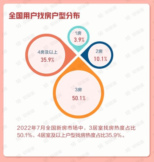 从户型来看,2022年7月全国新房市场中,3居室找房热度仍保持最高,占比50.1%,4居室及以上户型找房热度占比35.9%,2居室找房热度占比10.1%,1居室找房热度占比3.9%。