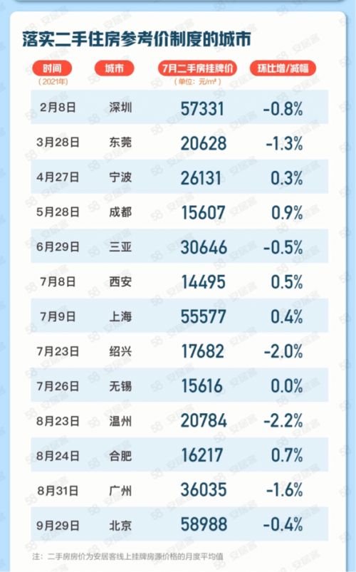 在已落实二手住房参考价制度的重点城市中,深圳、东莞、三亚、绍兴、温州、广州、北京的二手房挂牌均价环比下行。