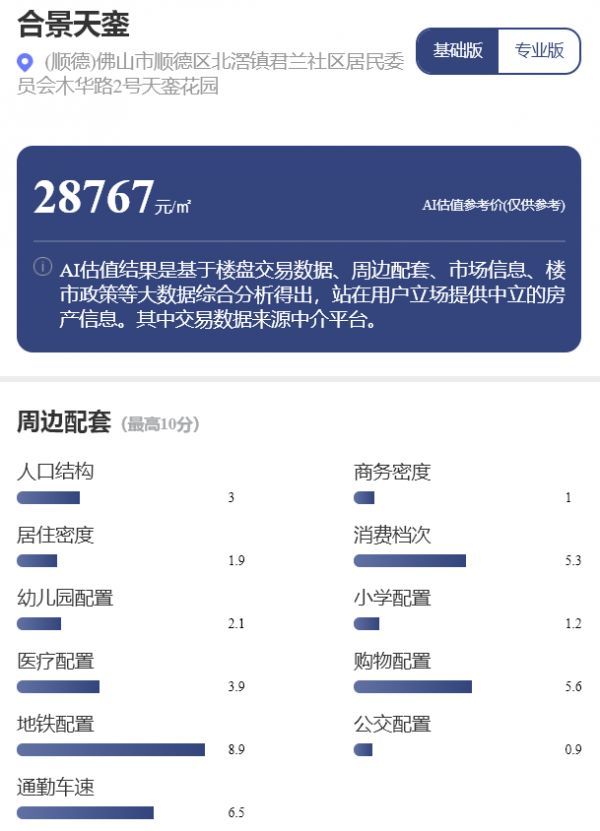 如位于顺德区北滘镇君兰社区的合景天銮,每经品房小程序显示,该项目的AI估值参考价约为2.88万元/平方米。