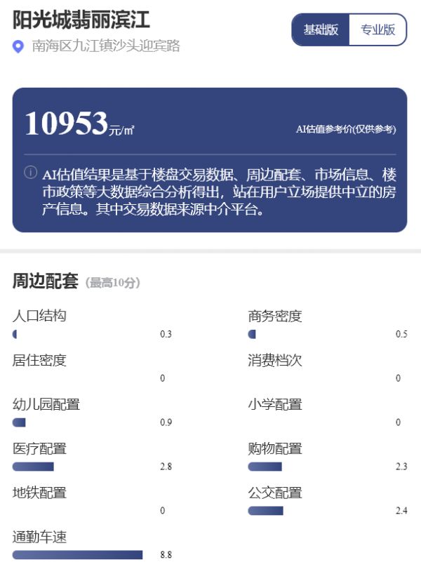 以位于佛山市南海区九江镇沙头迎宾路的阳光城(000671)翡丽滨江项目为例,每经品房小程序显示,该项目的AI估值参考价格约为1.1万元/平方米。