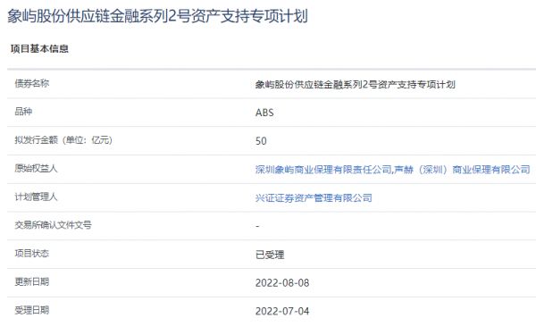 中国网地产讯 8月8日,据上交所披露,象屿股份供应链金融系列2号资产支持专项计划已获上交所受理。