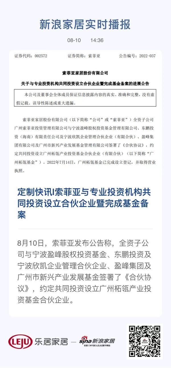 定制快讯|索菲亚发布关于与专业投资机构共同投资设立合伙企业的进展公告