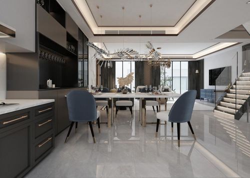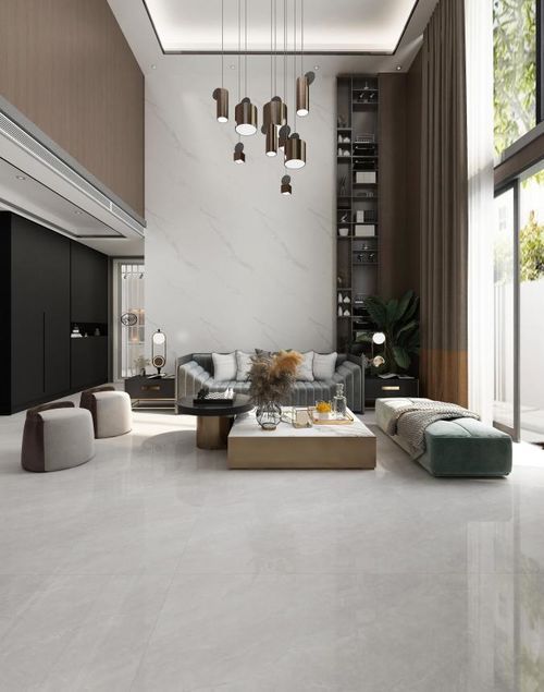 900x1800mm的【意大利白】用作客厅背景墙,俊逸的灰色脉络如川流不息的河流,气势磅礴,配合0.5mm连纹密缝铺贴带来惊艳的视觉享受,有效提升空间纵深感。地面铺贴深邃内敛的【芬迪灰】,大规格有效减少缝隙,打破传统规格带来的审美疲劳,赋予空间优雅独特的格调,营造宁静致远的意境,满足用户对高品质生活的追求。