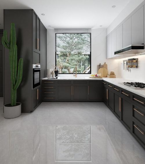 厨房延续客厅的设计格调,采用不同程度的中性色彩,气质柔和,嵌入式橱柜,整体干净利落,满足收纳的需求。墙面选用高雅纯粹的【云海白】,具有防渗防污的优越物理性能,彰显非凡的生活品位。900×1800mm的连纹密缝大板瓷砖【芬迪灰】,完美诠释雅奢生活范式,轻松驾驭各种空间设计风格,让有形的空间充满无限想象。