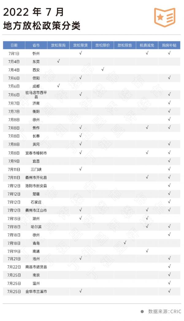 7月,49省市出台52次放松政策,并下沉到嘉兴市嘉善县、驻马店市西平县及新安县、衢州市开化县、南昌市进贤县这类县级市,政策力度普遍强于所在地级市。