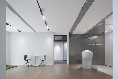 每家公司都要有独特的视觉特征,并与品牌形象保持一致,同时创建具有凝聚力的企业文化。展示墙运用了沉稳而优雅的金属灰色,搭配黑色边框,辅以流线条的导轨射灯照明,呈现出了一个精致高雅,又不失个性的高级的第一场景。