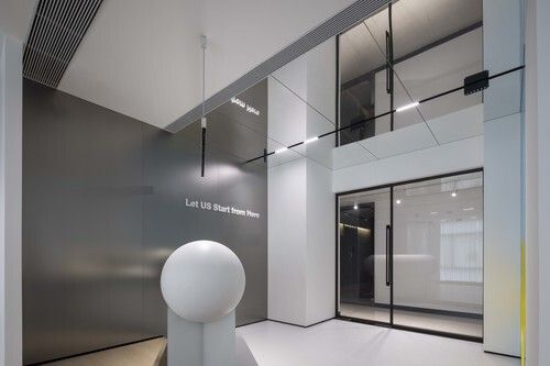 拉丝哑光金属饰面的墙身、镜面天花,设计师巧妙借助透明、折射、悬浮和镜像形成,赋予空间强烈的独特个性和未来感,是一次平衡美学与科学的交叠碰撞,也是一次思想维度上的空间实践,让办公人员和来访者之间超越物理距离的限制,产生妙趣横生的视觉互动。
