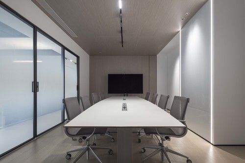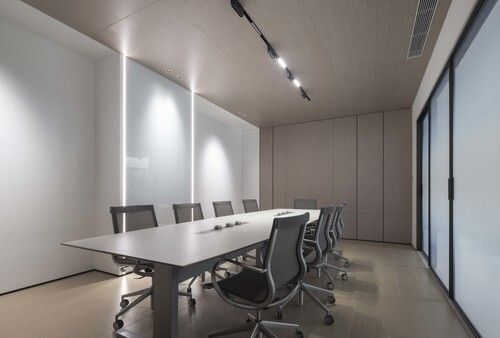 一道移动可伸缩收藏的渐变式半透明玻璃移门,既界定了功能区域,又能令视线穿透营造开敞的空间效果。高标配的会议室配以可手写的烤漆玻璃板和多媒体屏幕,灵动而自由的家具组合成为空间活动的主体,桌面活动式各功能导轨插座,让会议空间更具智能化。