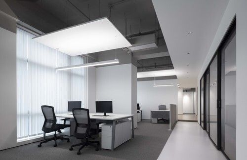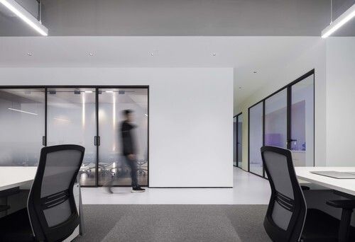 办公区以开放式布局来规划,采用裸露顶面和局部吊顶相结合的手法,增加天花高度的同时减去办公中的压抑感,精准舒适的定制专业灯光设置与极简黑白的办公家具相得益彰,形成一个安静理性的氛围,整个空间功能划分明显又兼具流动性。