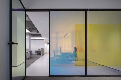 半通透性的彩色镭射玻璃是开放办公空间的设计亮点,不仅使视觉上模糊了墙体的坚实感,消除了空间分割呆板的印象;而且使工作环境更具有活力氛围,激发员工创意。