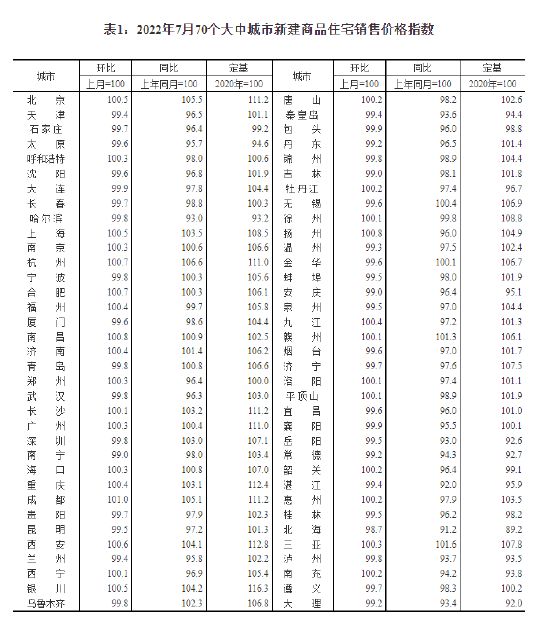 2022年7月份70个大中城市商品住宅销售价格变动情况