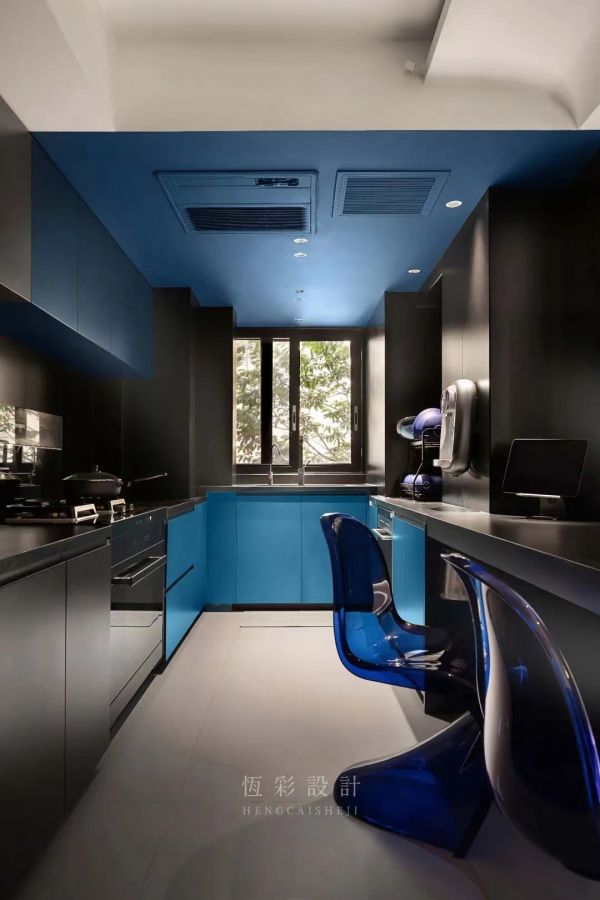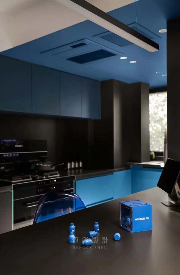 【陆清华】:我的新家是一套50平的现代简约风loft,把很多自己心痒已久但是别人家不敢用的设计,都用在了自己家里。比如,悬浮式楼梯、透明卫生间、蓝色调的大范围使用、衣帽间与洗衣房一体化设计……餐厨区是我最满意的空间之一,做成厨房+岛台一体化开放式设计,两个空间用了不同的颜色作为功能区分(厨房蓝色,餐厅灰色)。