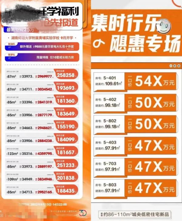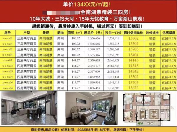 从周伟发来的宣传海报看,比如位于知识城板块的越秀·星汇城项目,有5套特惠房源售价约2.3万元/平方米,而据房天下数据,星汇城的销售均价为2.7万元/平方米;位于荔湾区的万科·金域曦府项目,在近期推出的“嗨购818”购房活动中,一口价格房源优惠40万元;位于黄埔鱼珠片区的中鼎君和名城珺合府,宣传海报显示,一套99.18平方米的房源,总价为50X万元,若以509万元计算,折合单价约5.13万元/平方米,房天下数据显示,该项目销售均价为5.4万元/平方米。