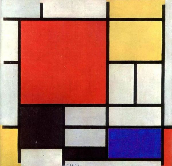 巧妙的分割与组合,使平面抽象成为一个有节奏、有动感的画面,从而实现了他的几何抽象原则,“借由绘画的基本元素:直线和直角(水平与垂直)、三原色(红黄蓝)和三个非色素(白、灰、黑),这些有限的图案意义与抽象相互结合,象征构成自然的力量和自然本身。
